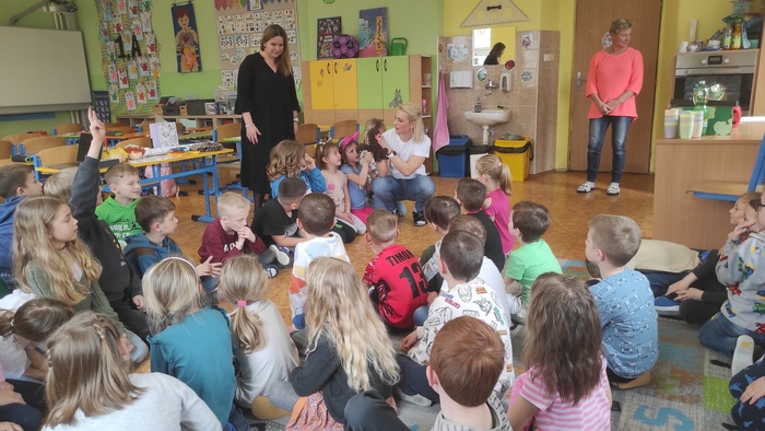 Paní učitelka první třídy Mgr. Lucie Trachová je přivítala s úsměvem a vlídností, čímž hned rozptýlila případné obavy malých návštěvníků. Připravila pro ně pestrý program, během kterého si mohli vyzkoušet různé školní předměty-češtinu, matematiku, prvouku, hudební výchovu, objevovali svět kolem sebe a dokonce se naučili několik anglických slovíček.