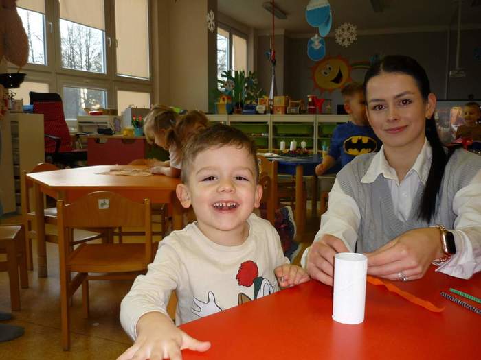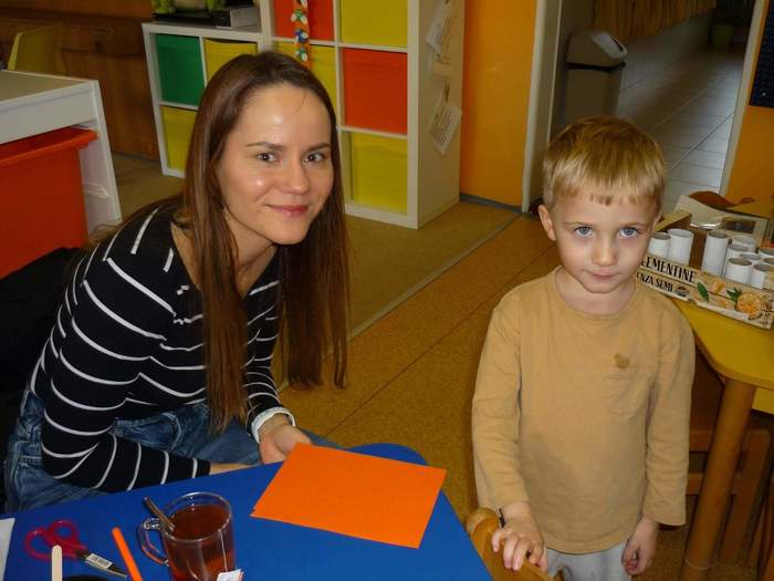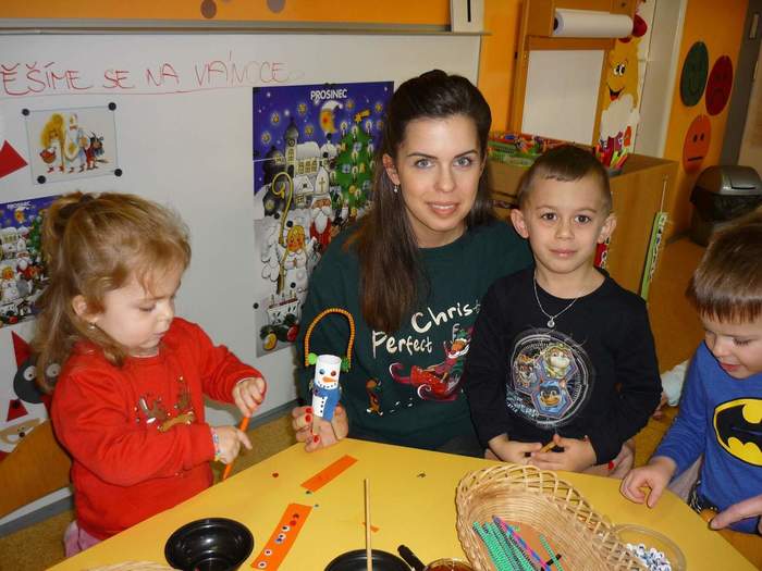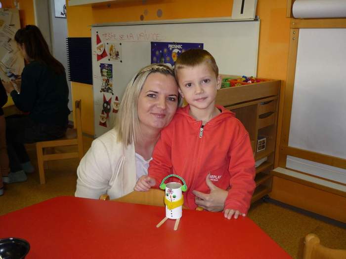 Děti s rodiči tvořili sněhuláka z ruličky. Během celého odpoledne jsme poslouchali vánoční koledy. Každý si odnášel vánoční výrobek a především pocit, že se můžeme setkávat nejen ve dveřích tříd.