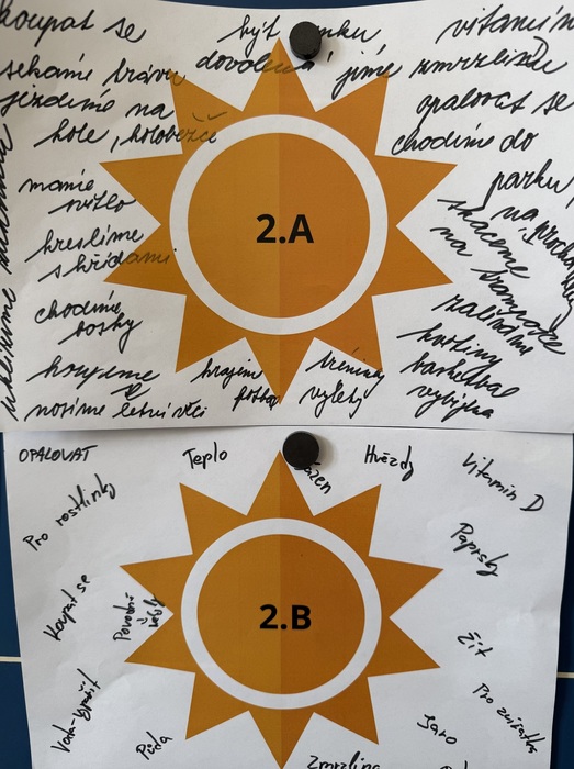 Ve skupinách vznikala originální sluníčka s paprsky z obkreslených a vystřižených dětských rukou. Nechyběla ani pohybová aktivita na berušky a stromy, která všechny krásně rozhýbala. Na závěr děti plnily venkovní stezku s otázkami a tajenkou Aprílový žert. Odměnou jim byla sladká drobnost a sluníčková medaile.