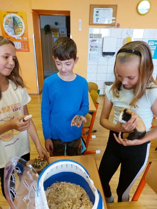 V pátek 7.6. bylo v naší škole obzvlášť veselo. Mohli jsme si přinést své živé malé domácí mazlíčky. Tak se ve škole objevila morčátka, králíčci, želvičky, ale i rybičky, pavouček a mravenci. Popisovali jsme, jak vypadají, povídali jsme si, co potřebují ke svému životu a jak se o ně staráme. Po velké přestávce nám dospělí také přivedli 1 pejska a 1 kočičku. Mohli jsme si s nimi zaběhat, pohrát, pomazlit se. V závěru dne jsme své mazlíčky také namalovali.
