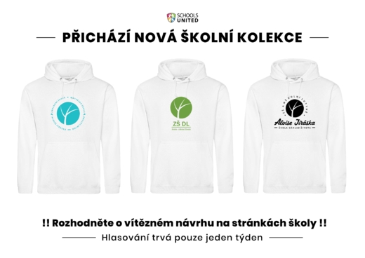 Do školy přichází nová školní kolekce oblečení a jste to právě Vy, kdo rozhodne o její podobě! Hlasujte do 21.2.2023 o tom, který ze tří motivů se Vám líbí nejvíce. Vítězný motiv potom použijeme na vytvoření celé kolekce, kde najdete nejen mikiny a trička, ale i tepláky, batohy, čepice a další kousky.
