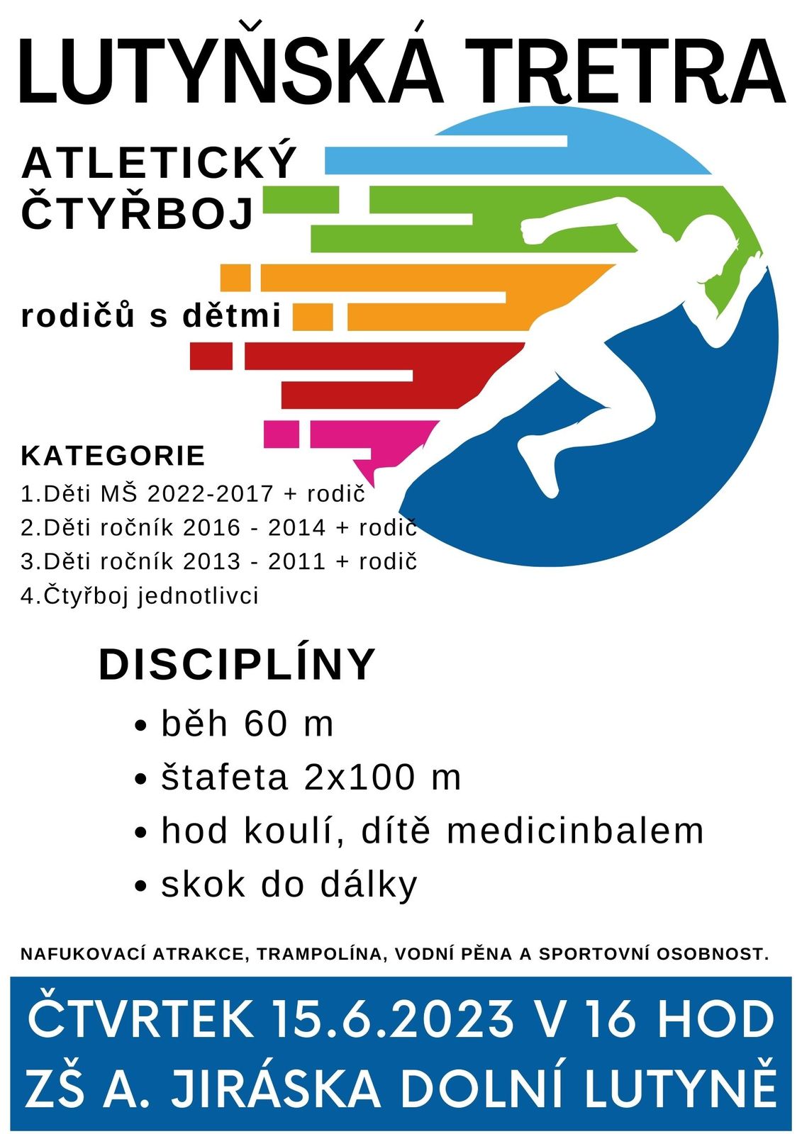 Ve čtvrtek 15.6. 2023 od 16.00 h na atletickém oválu ZŠ A. Jiráska se bude konat tradiční lutyňský čtyřboj. Přijďte si zasportovat se svými dětmi a podpořit soutěžící. Více informací v příloze.