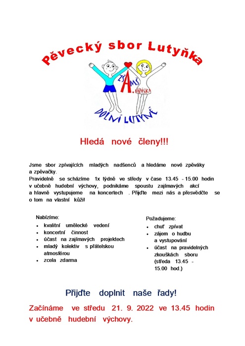 Hledáme nové členy do pěveckého sboru při Základní škole v Dolní Lutyni.