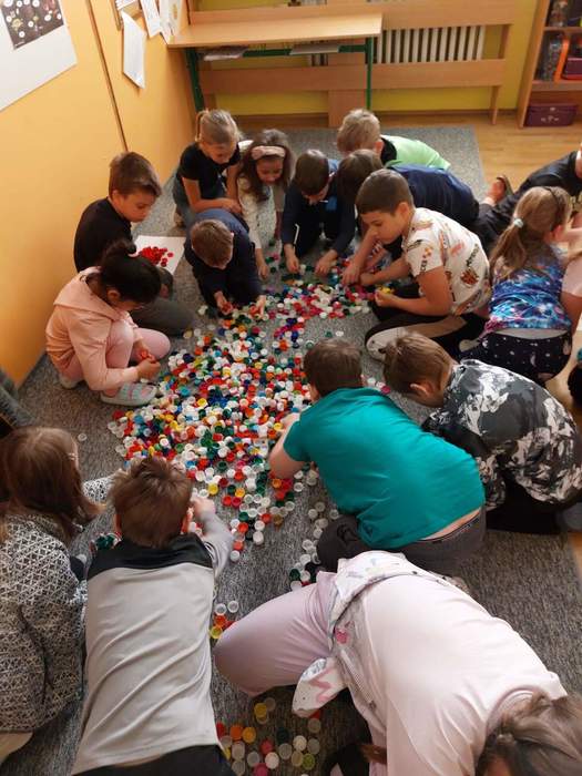 se svými rodiči. Z víček od pet lahví děti vytvořily tematické obrázky.