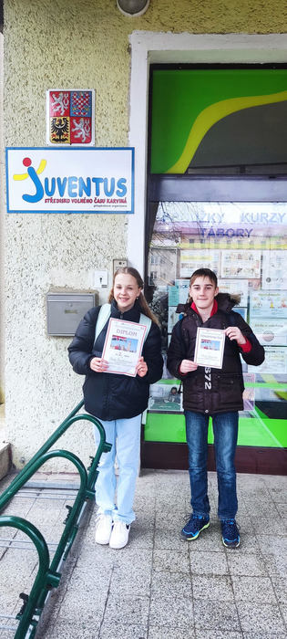 Naši školu reprezentovali Stela Šnoblová v kategorii ZŠ/VG I. a Daniel Adamczyk v kategorii ZŠ II. Oba nejprve čekala poslechová část, kterou zvládli naprosto bravurně, pak se přesunuli na konverzaci, kde nejprve mluvili na vylosované téma, a pak čelili zákeřným otázkám zkušební komise.