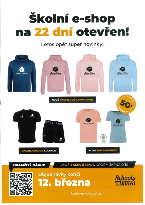 již v loňském roce proběhla akce školního e-shopu, kde byla možnost si zakoupit volnočasovou školní kolekci oblečení a dalšího zboží.